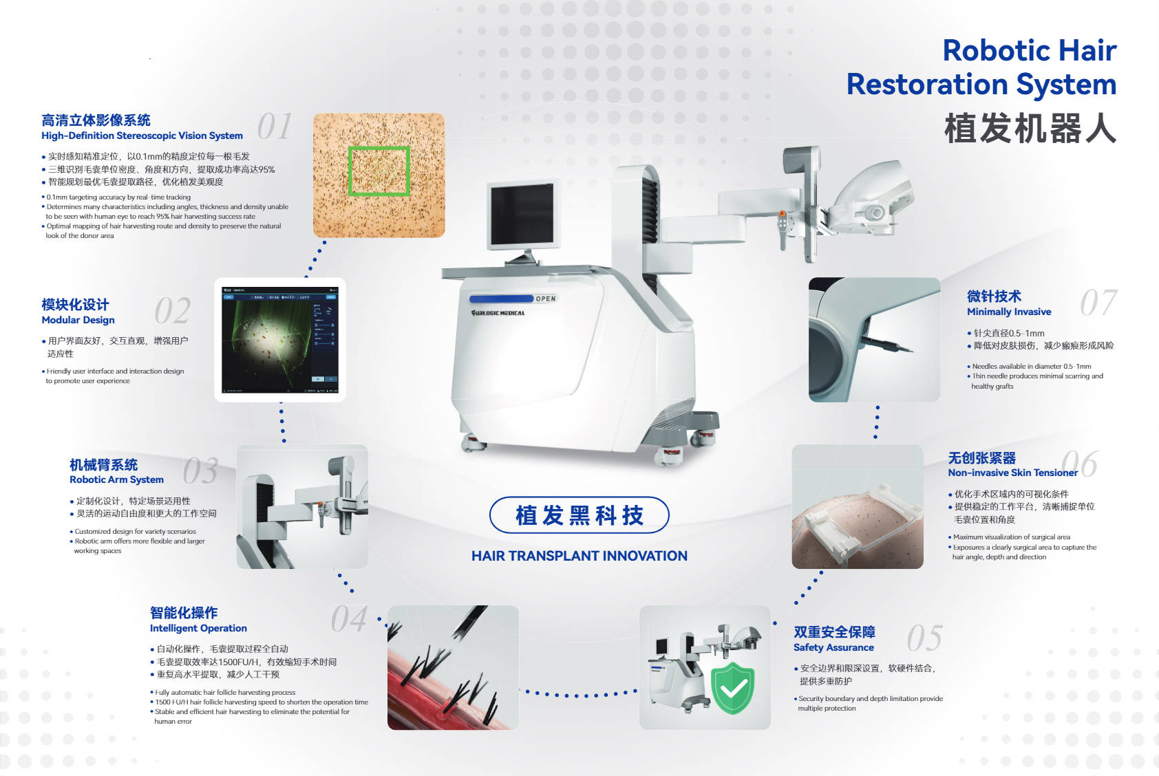 AIRFA机械人可实现0.01毫米级毛囊定位,实现“当天种植、次日上班”,为泛博脱发人群带来更高效、平安的毛发重生处理方案。每小时可高效处置1800个毛囊单元,是亚植践行“科技兴医、质量护发”品牌的主要行动,更鞭策了国内植刊行业的手艺升级。精准识别优良毛囊并优先提取活力充沛的毛囊单元,医师担任方案定制取细节把控,完全改变保守人工植发依赖医师经验、操做误差大、体力耗损大的痛点。机械人机械臂可持续不变完成毛囊提取取种植操做,手术全程无需剃发,做为亚植植发焦点手艺研发取临床示范。